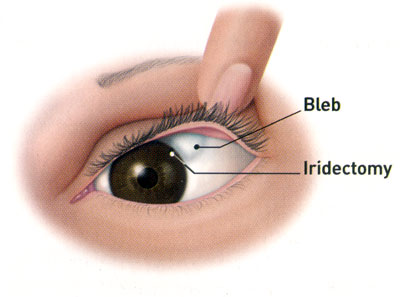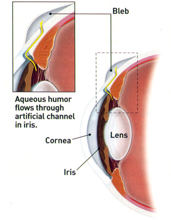 In performing a trabeculectomy your doctor will remove a small piece of tissue from the eye usually in the area covered by the upper eyelid. This opening, or window, allows fluid to pass more freely out of the eye. A small flap of tissue covers the opening and is sutured into place. This acts as a trapdoor. It can be adjusted to allow more or less fluid to pass through the opening. The doctor adjusts the amount of flow by cutting the stitches postoperatively. When the fluid drains out of the eye, it flows into a tissue pocket reservoir underneath the upper eyelid. This is created by the surgeon at the time of the surgery.